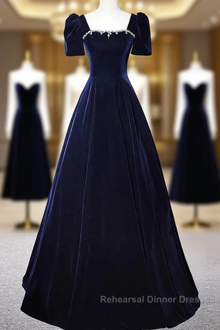 Navy Blue A-Line Velvet Long Evening Dress, Short Sleeves Beaded Semi Formal Prom Dress