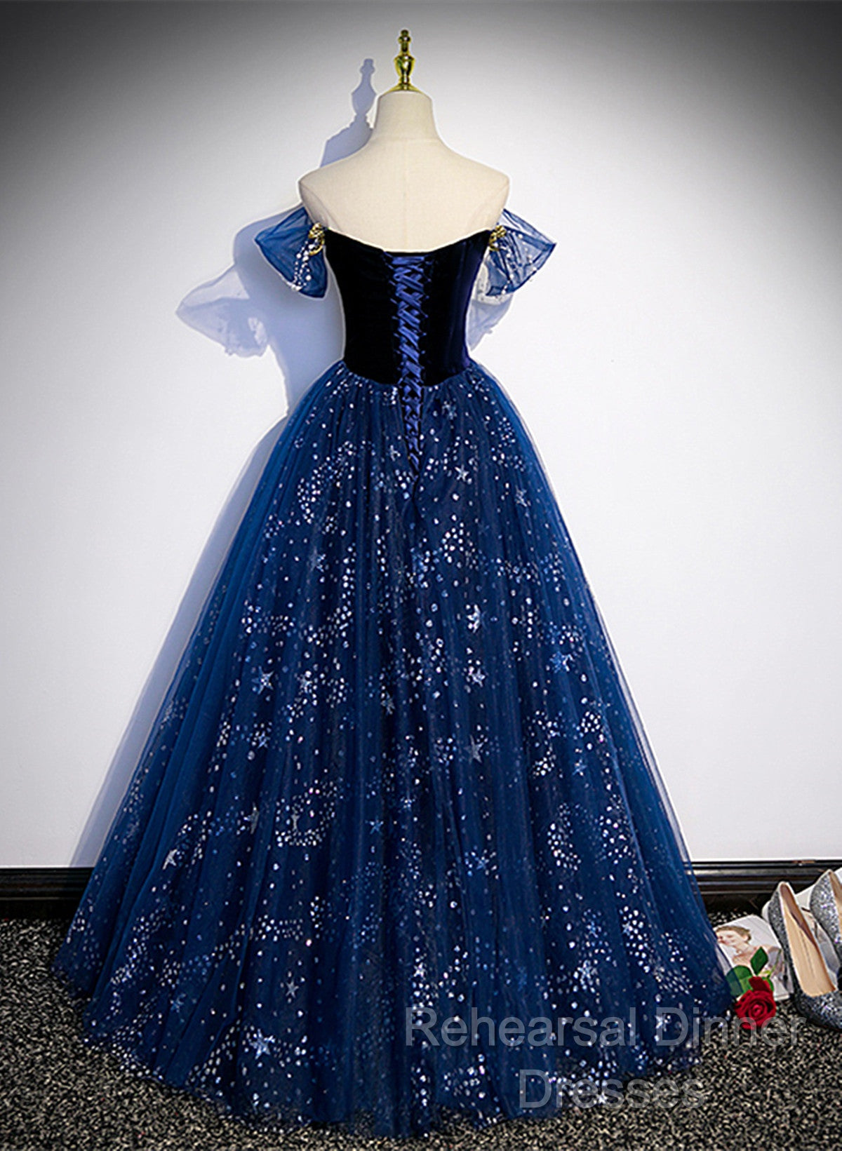 Navy Blue Tulle Off Shoulder Beaded Long Party Dress, Navy Blue Tulle Semi Formal Prom Dress