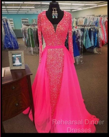 Pink Sequin Semi Formal Prom Dresses Long Sleeves V Neck Evening Gowns With Train