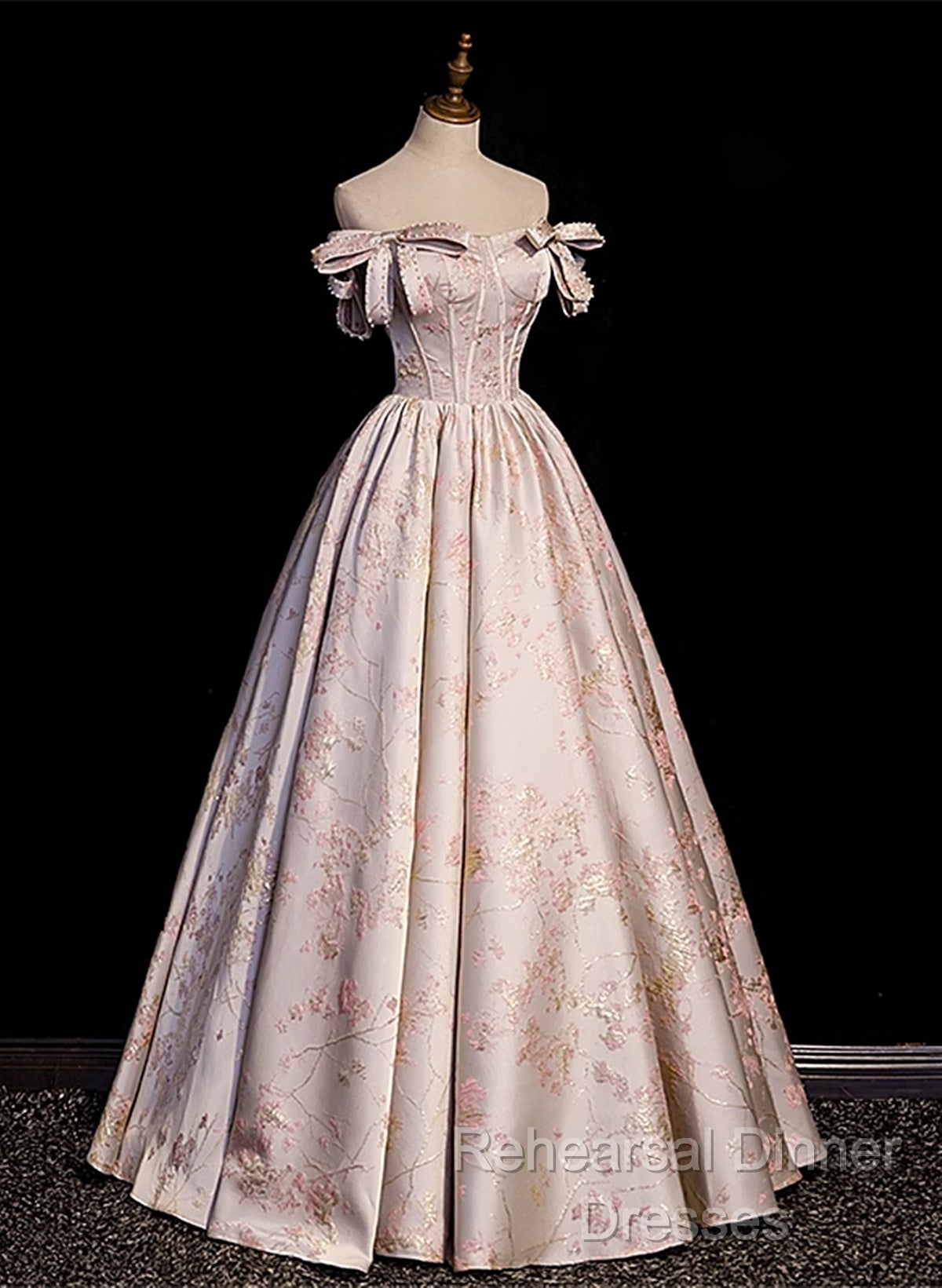 Pink Statin Off Shoulder Floral Long Party Dress, Pink Sweetheart Semi Formal Prom Dress Evening Dress