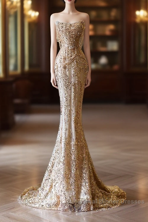 Pretty Mermaid Strapless Gold Sequin Beads Long Semi Formal Prom Dresses Formal Evening Dress