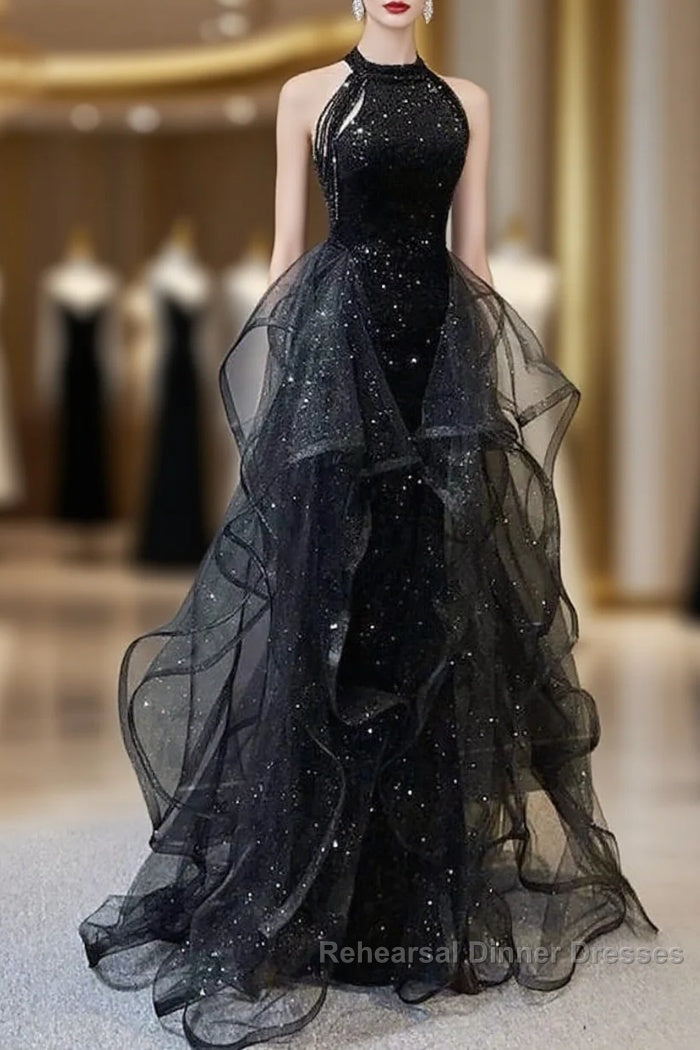 Semi Formal Prom Dresses Sparkle & Shine Dress Wedding Partysleeveless Halter Wednesday Addams Family Sequined With Crystals Sequin Ruffles