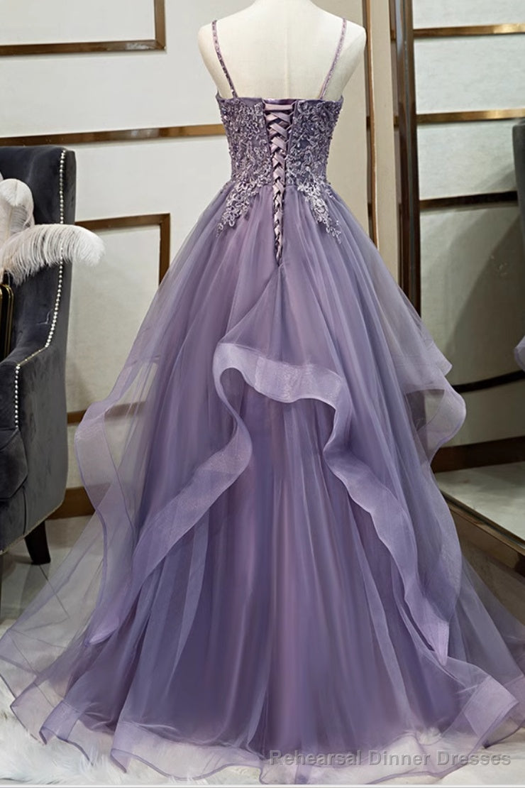 Expertly crafted with a flattering A-line silhouette, this purple tulle prom dress is both elegant and stylish. The delicate lace appliques add a touch of romance, while the v-neckline and spaghetti straps accentuate your figure. Perfect for any formal event, this dress is sure to make a statement.