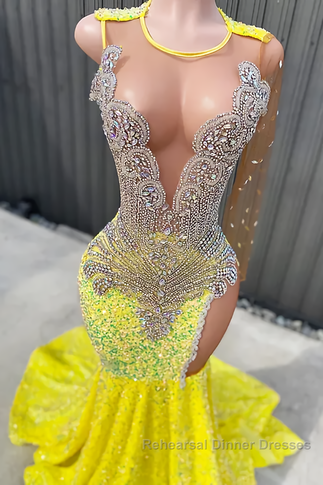 Enhance your natural curves with our Round Neck Silver Beaded Mermaid Yellow Sequin Semi Formal Prom Dresses. The intricate beading and sequins add sparkle and shine, while the mermaid silhouette accentuates your figure. Perfect for any special occasion, this Dresses will make you stand out and feel confident.