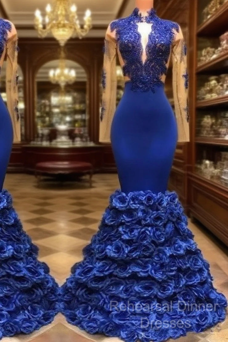 Royal Blue Robe De Soiree Mermaid Long Sleeves Flowers Lace Beaded Sexy Long Party Semi Formal Prom Dresses Semi Formal Prom Gown Evening Dresses