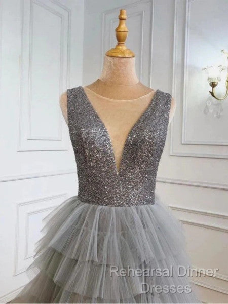 Ruffles Tulle V Neck Gray Sequin Long Semi Formal Prom Dress