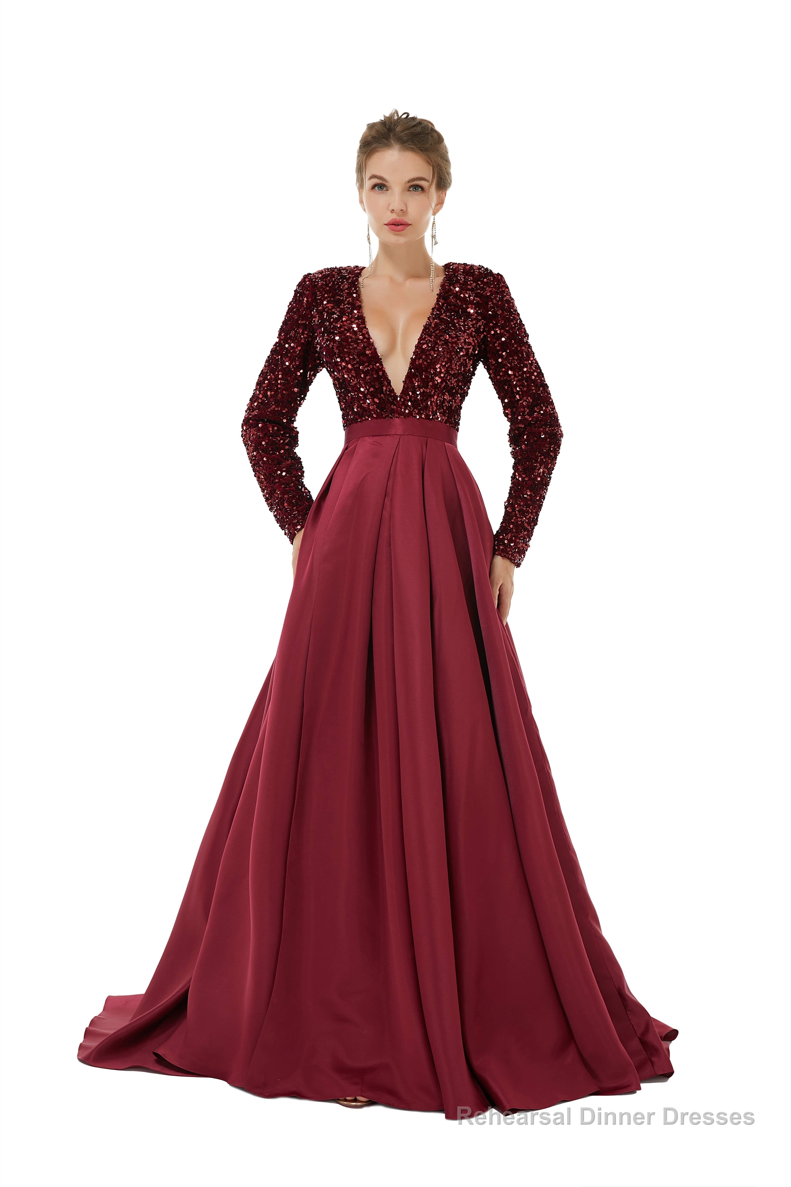 Sequined Satin A Line Front Slit V Neck Full Sleeve Sweep Train Long Prom Dresses