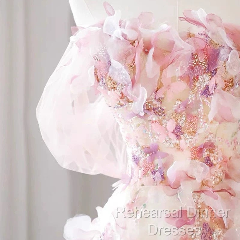 Sexy A Line Off The Shoulder Pink Tulle Floor Length Floral Semi Formal Prom Dresses