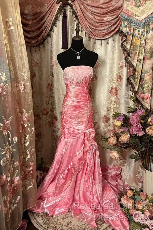 Sexy Mermaid Strapless Pink Satin Long Evening Dress Party Dress Semi Formal Prom Dresses