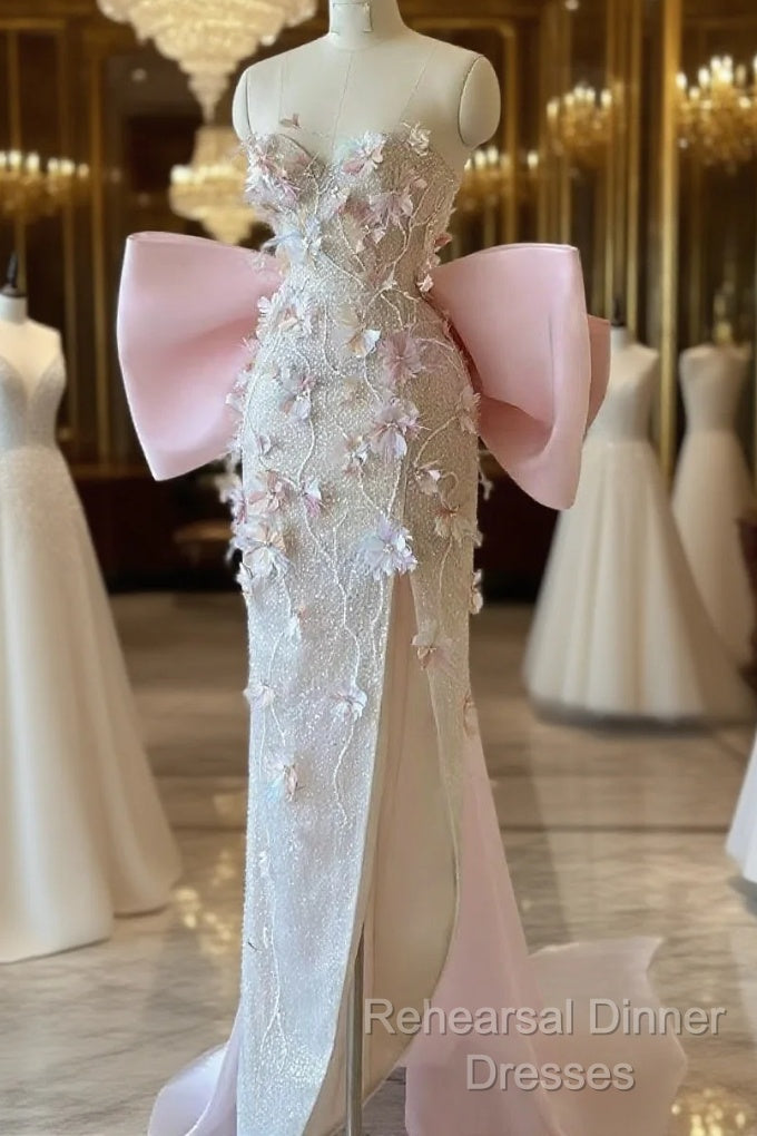 Sexy Mermaid Strapless Pink Sequin Long Floral Semi Formal Prom Dresses Party Dress