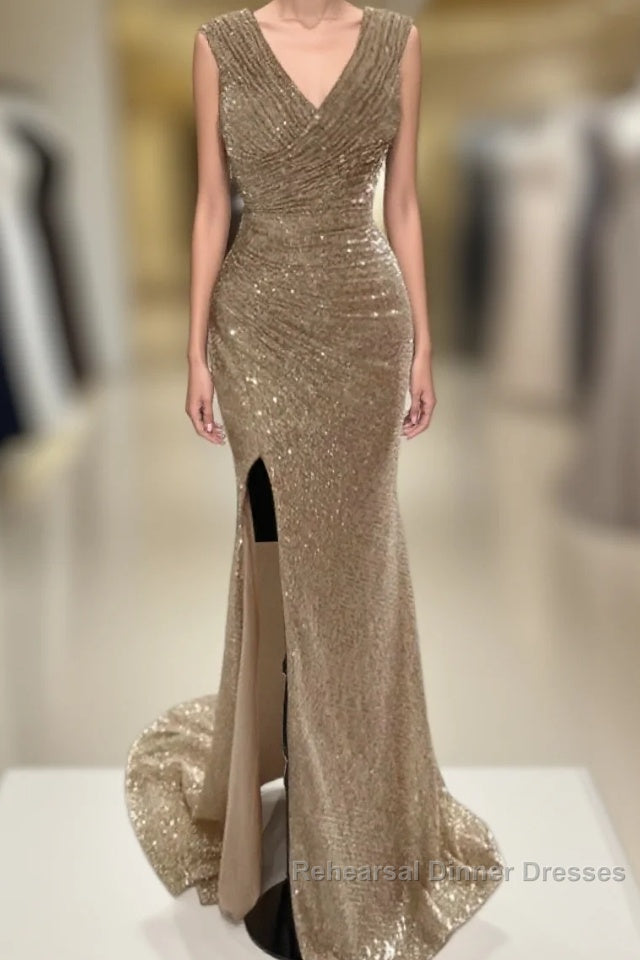 Sheath / Column Semi Formal Prom Dresses Sparkle & Shine Dress Cocktail Party Sweep / Brush Train Sleeveless V Neck Sequined With Glitter Ruched Slit