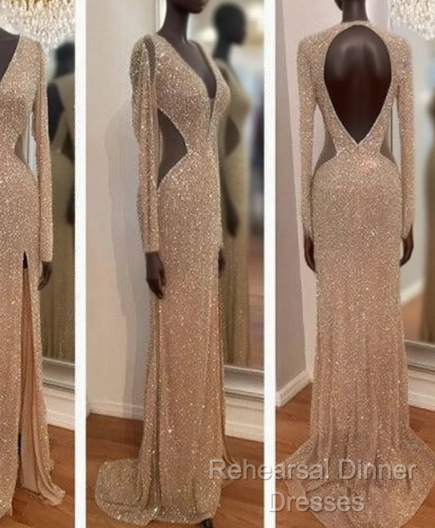 Sheer Sexy Sequins Long Sleeves Semi Formal Prom Dresses