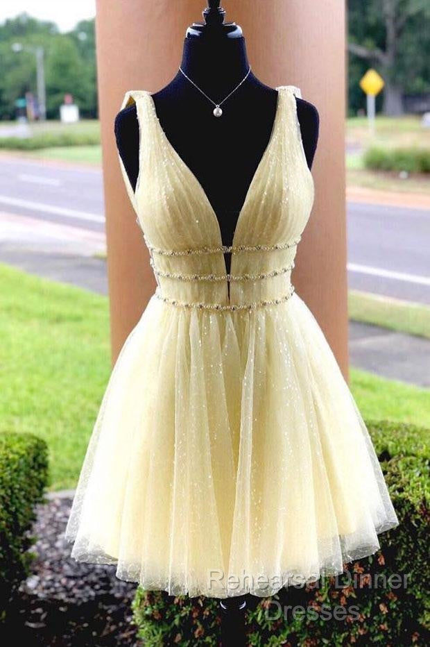 Shiny V Neck Short Blue/Yellow Semi Formal Prom Dressses, Short Blue/Yellow V Neck Fomal Homecoming Graduation Dresses
