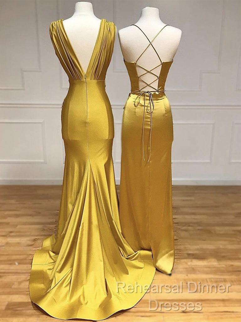Simple Satin Gold Long Semi Formal Prom Dress, Gold Satin Long Formal Dress