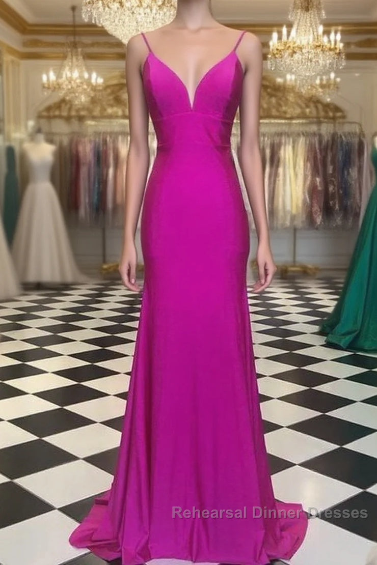 Simple Spagehtti Straps Fuchsia Satin Mermaid Semi Formal Prom Dress