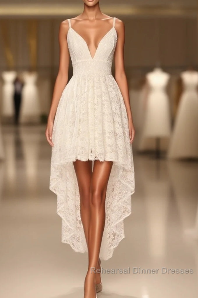 Simple Spaghetti Straps Hi-Lo Semi Formal Prom Dress,White Lace Semi Formal Prom Dress