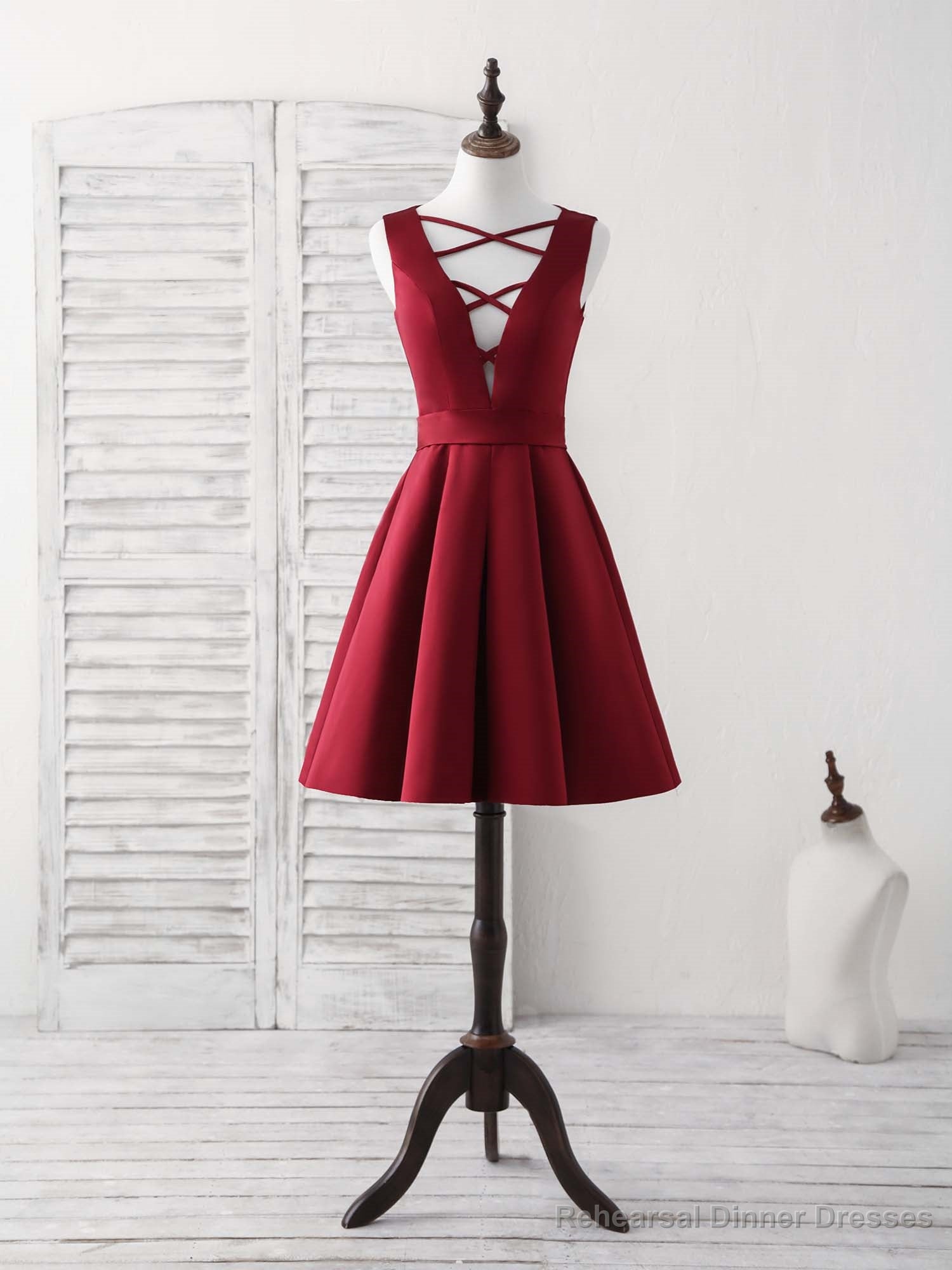 Simple V Neck Burgundy Short Prom Dress Satin Homecoming Dress