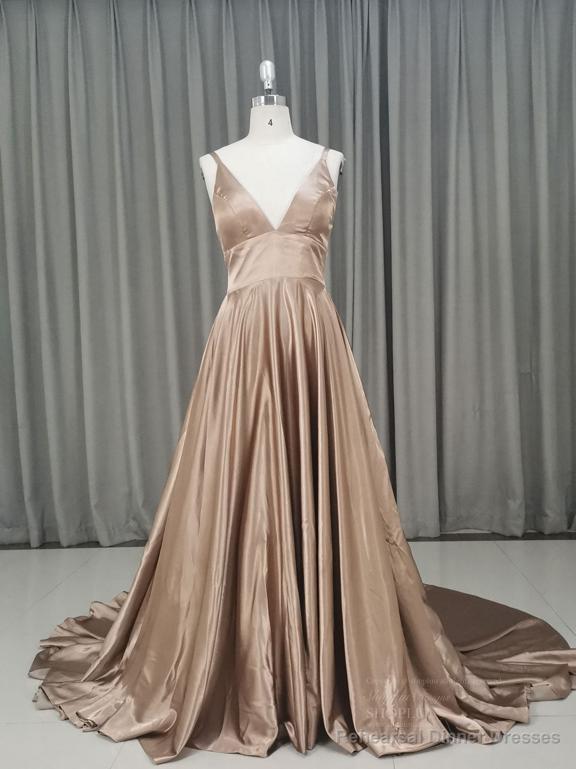 Simple v neck satin champagne long prom dress champagne evening dress