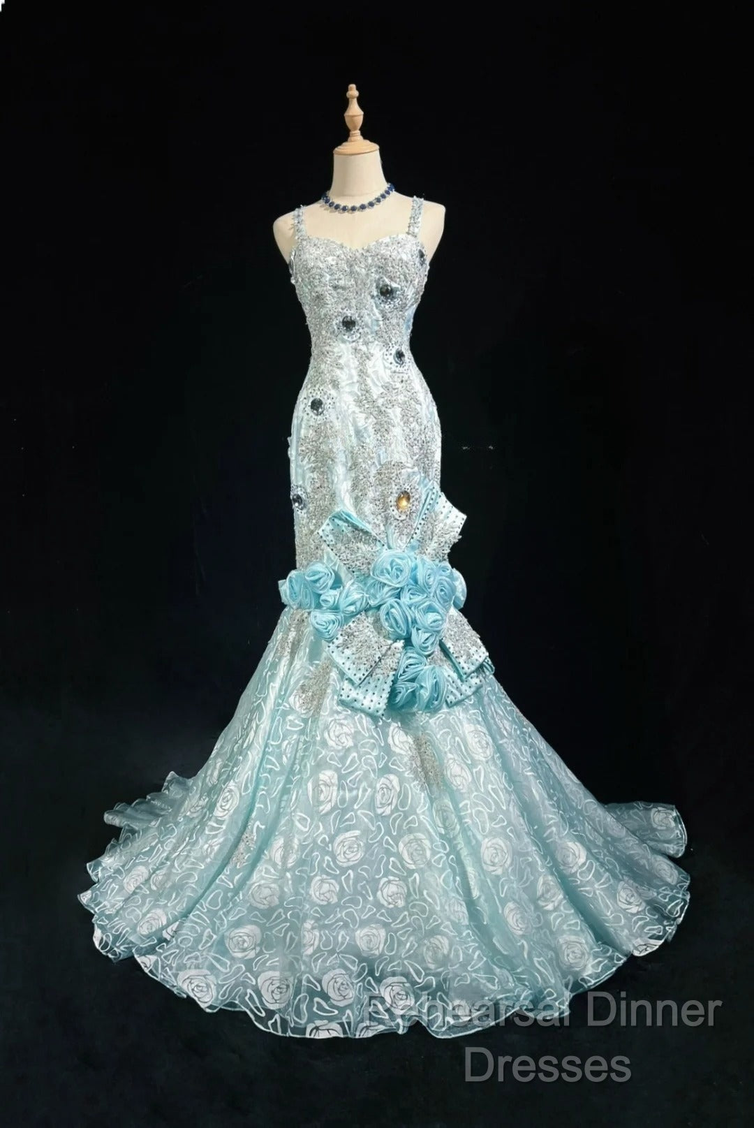 Sky Blue Mermaid Spaghetti Straps Organza Diamond Long Semi Formal Prom Dress Lace Floral Evening Gown