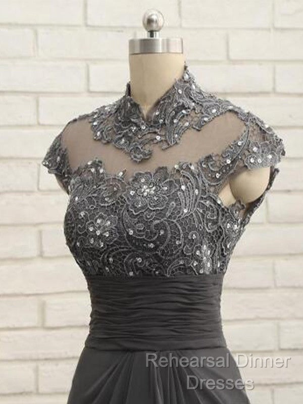 Slim Fit Column Chiffon Lace High Neck Short Sleeved And Floor Length Style Mother Of The Bride Dresses