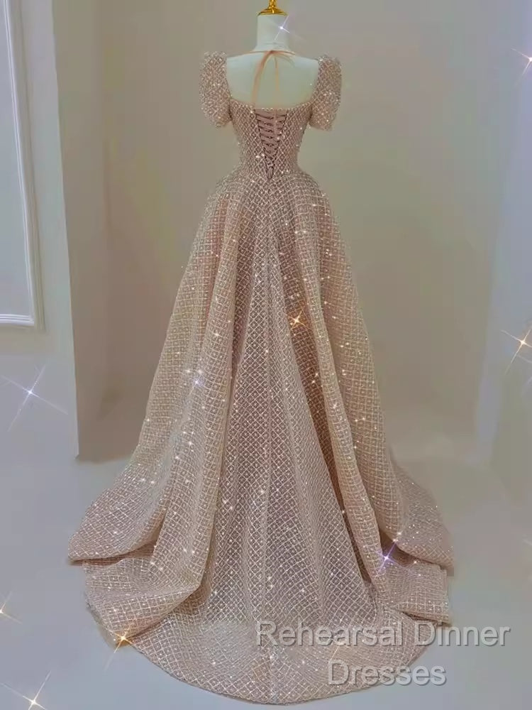 Sparkle A Line Square Neckline Sequin Pink Long Semi Formal Prom Dress