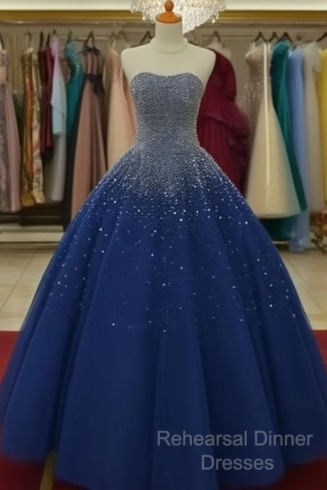 Sparkly Beaded Strapless Navy Blue Ball Gown Semi Formal Prom Dresses