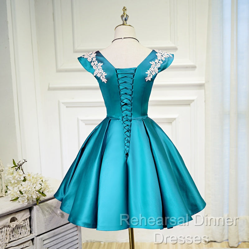 Teal Blue Satin Short Party Dress With White Lace, Blue Homecoming Dress Semi Formal Prom Dress