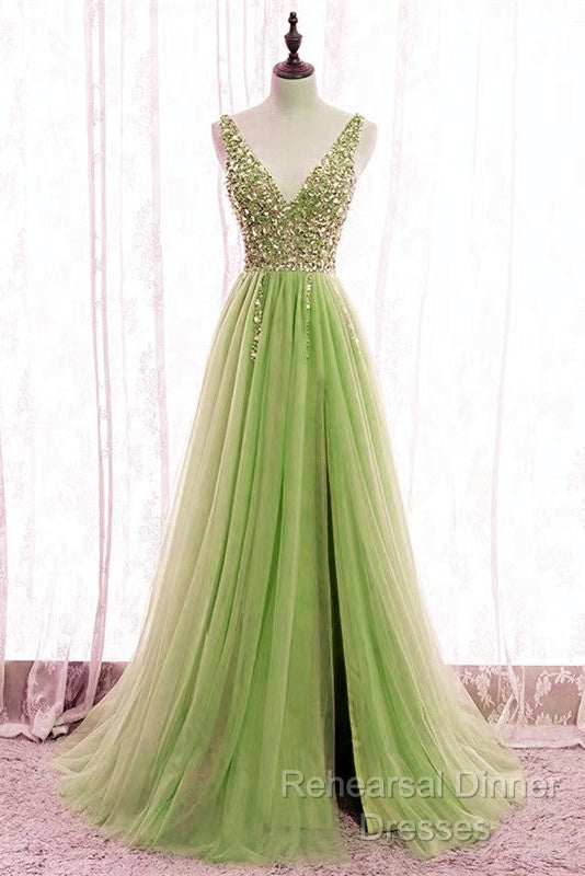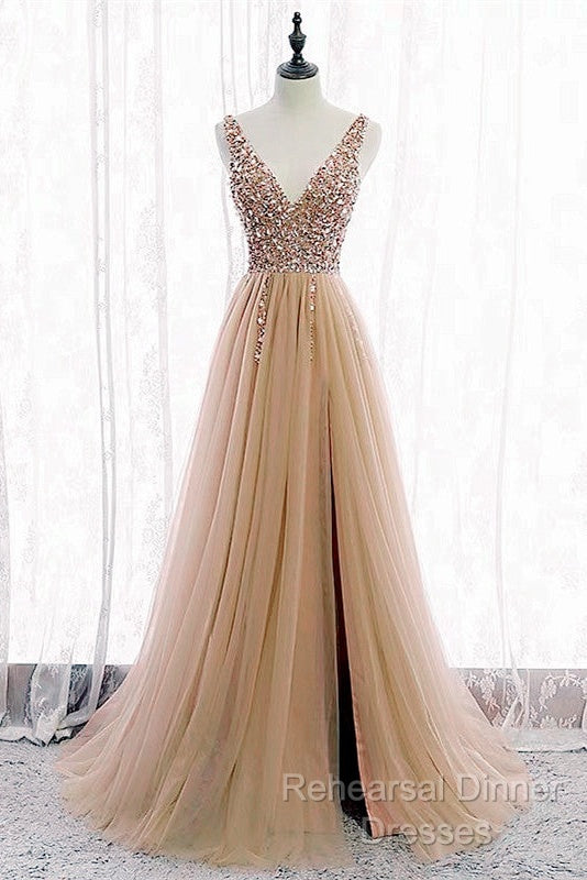 Tulle V Neck Sequins Beaded Dresses With Slit