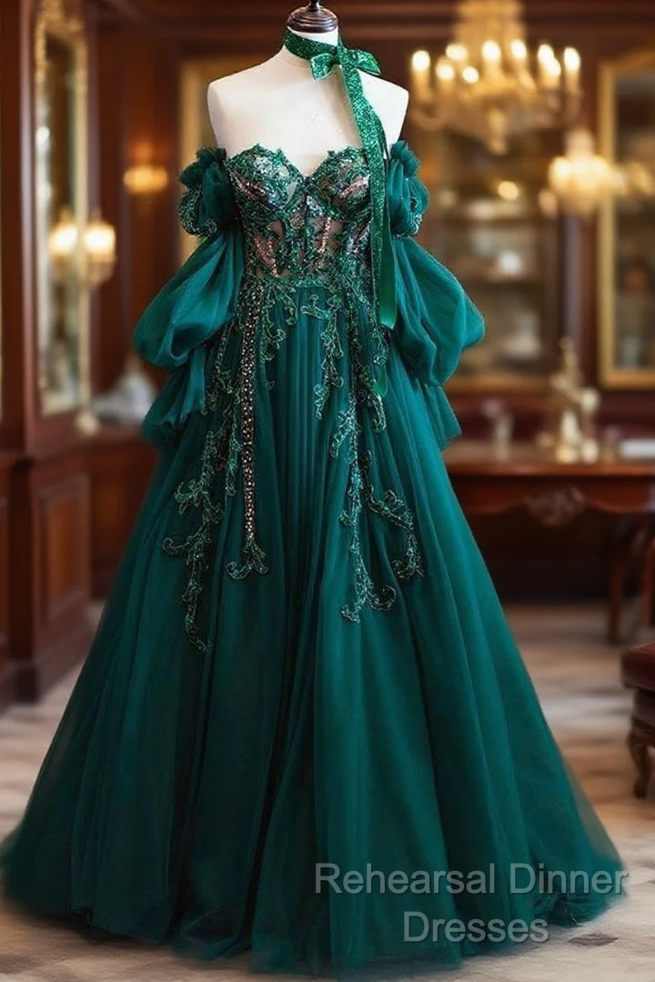 Vintage A Line Appliques Lace-Up A-Line Dark Green Tulle Semi Formal Prom Dresses