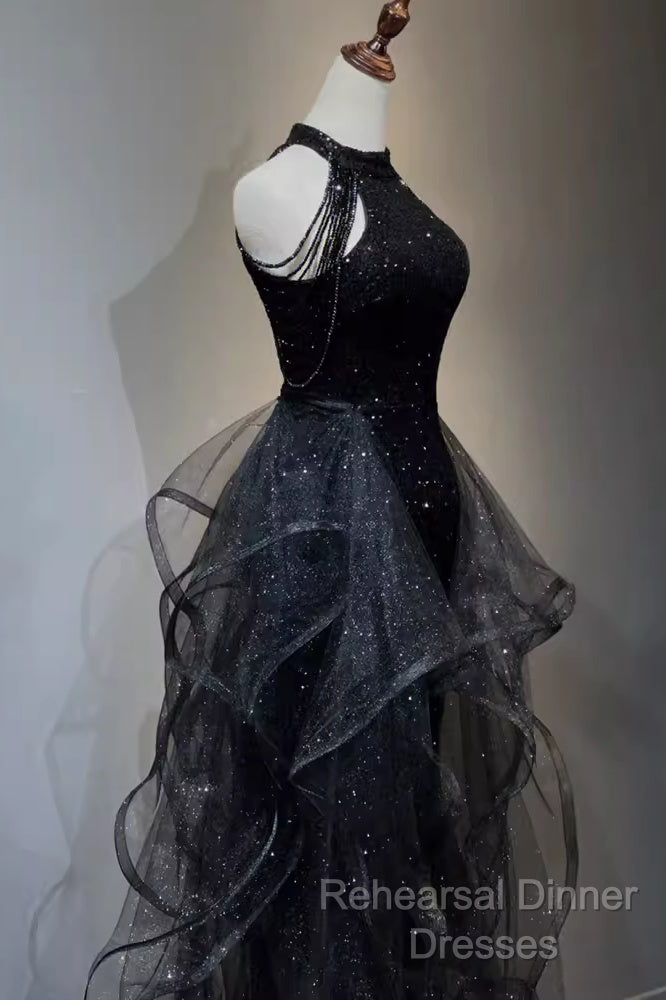 Vintage A Line Halter Black Party Dresses Sequin Semi Formal Prom Dresses