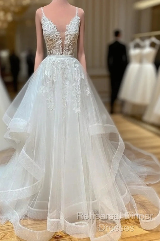 White V Neck Tulle Lace Long Semi Formal Prom Dress White Lace Wedding Dress