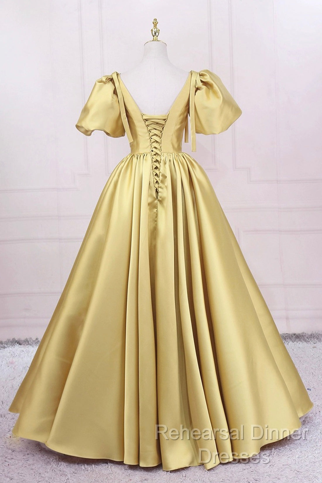 Yellow V-Neck Satin Long Semi Formal Prom Dress, A-Line Puff Sleeves Evening Party Dress